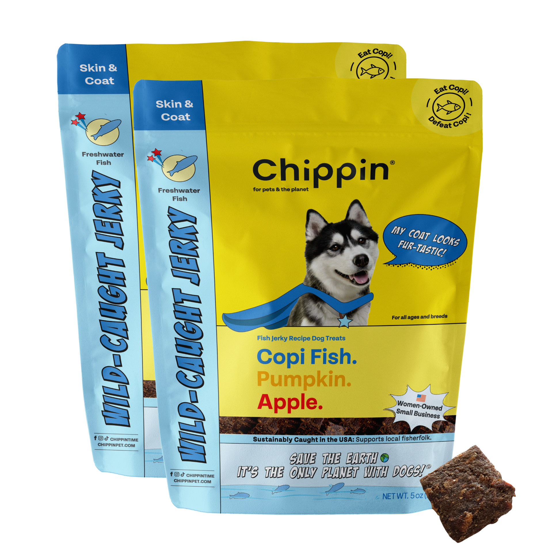 Reduce your pup's carbon-pawprint with these Jerky Dog Treats: Silver Copi, Pumpkin, and Apple from Chippin! These soft, easily breakable jerky bites are fantastic for enhancing a training routine, as a meal topper, or as a nutritious and special treat for your dog. Featuring USA wild-caught Silver Copi, this tasty jerky is omega-3-rich to support your pup's skin and coat, soothe itchy skin, and support joint health. Our sweet furry friends are currently responsible for 30% of the world's meat consumption, an industry that puts a major strain on our planet. Chippin has found a better, more sustainable solution with USA wild-caught silver copi. By fishing for silver copi, an overpopulated fish, this treat helps to restore biodiversity to US waterways and protect the Great Lakes.