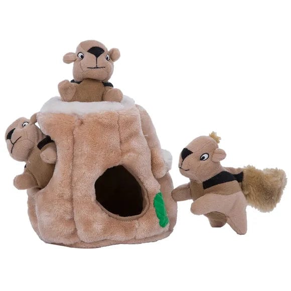 This interactive hide-and-seek toy comes with 1 small log and 3 small squeaky squirrel.