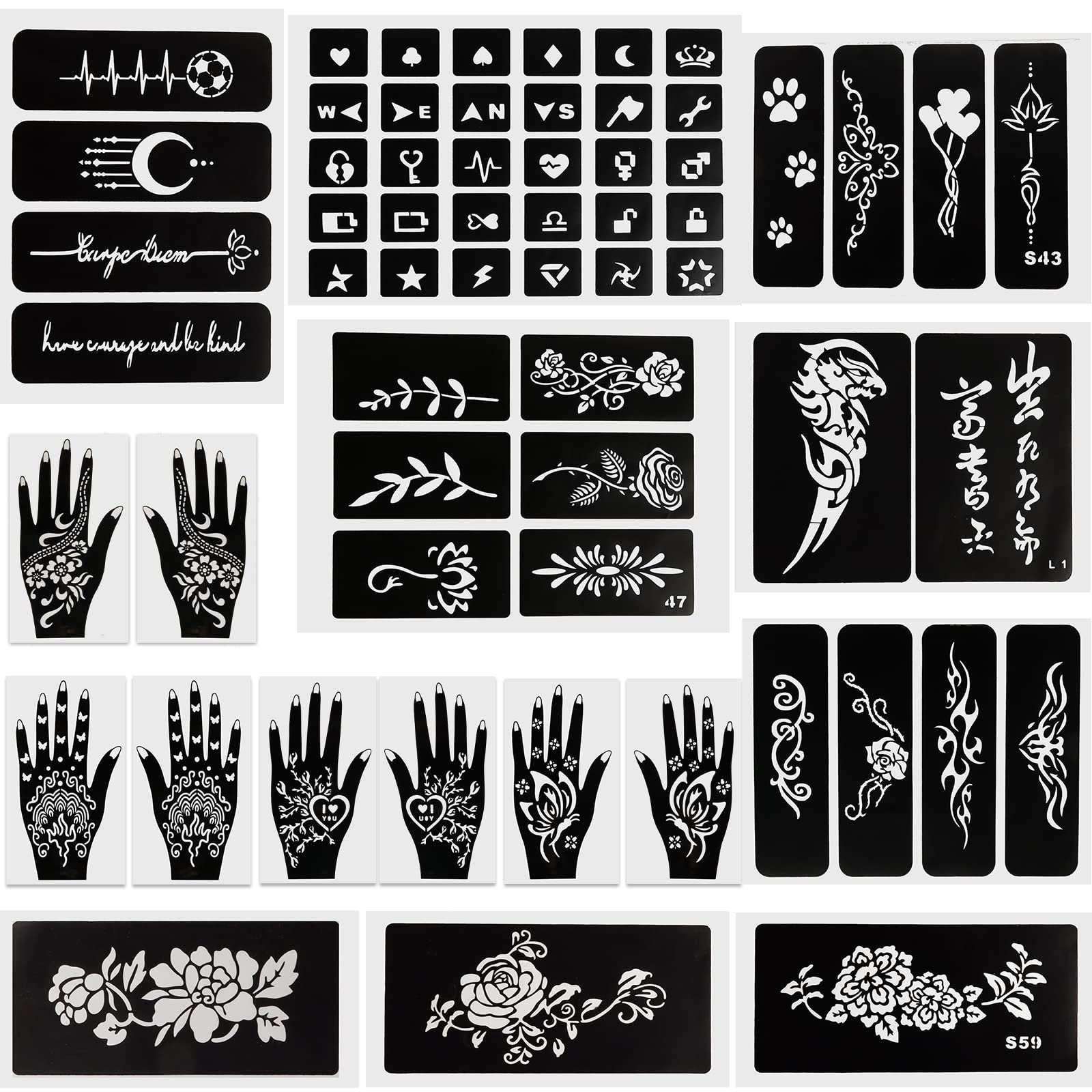 - 1、 Kapopi henna tattoo set Includes a variety of different styles and designs of hand stencils and floral tattoo stencils for you to create beautiful, unique and perfect tattoos.