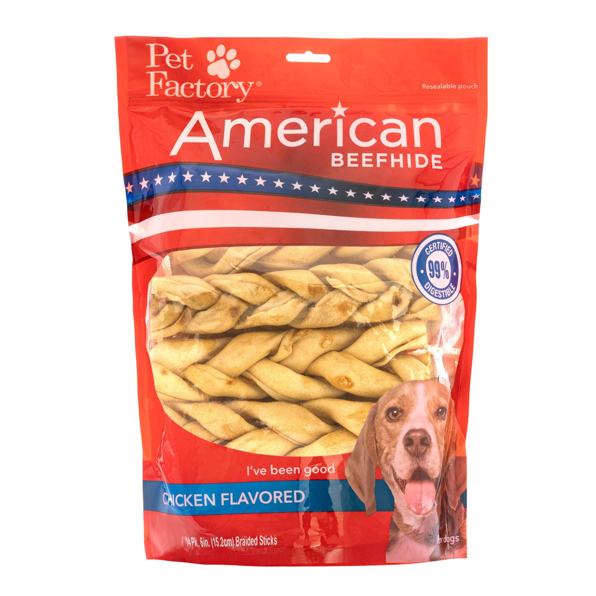 Pet Factory American Beefhide braided sticks are made from thick premium American beefhide to satisfy your dog’s urge to chew. Your dog will enjoy the mouthwatering flavor of our braided sticks. Pet Factory American Beefhide Braided Sticks are offered in Original or Chicken flavors.