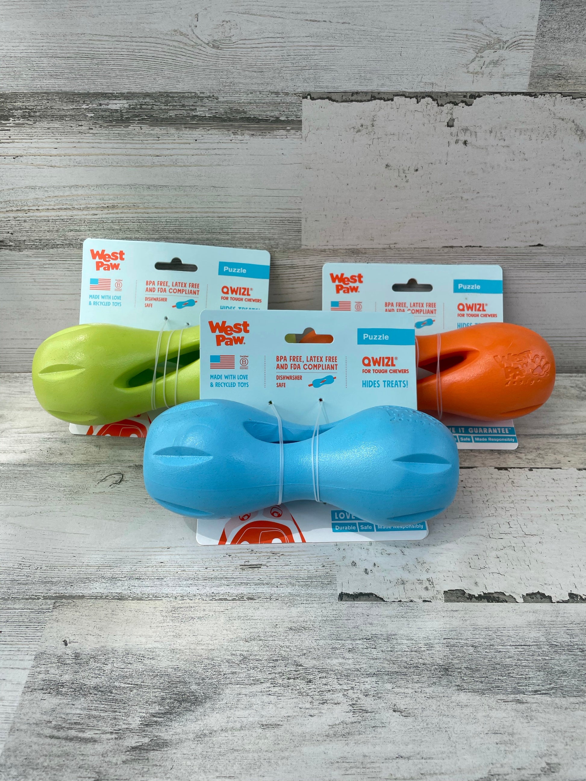 BUILT FOR TOUGH CHEWERS Qwizl is a super tough treat toy that's brilliantly designed to extend the life of expensive dog treats while keeping dogs busy. Side openings release scent and taste while the continuous interior hole allows treats to extend out. Flexible ridges grip multiple sizes of treats.